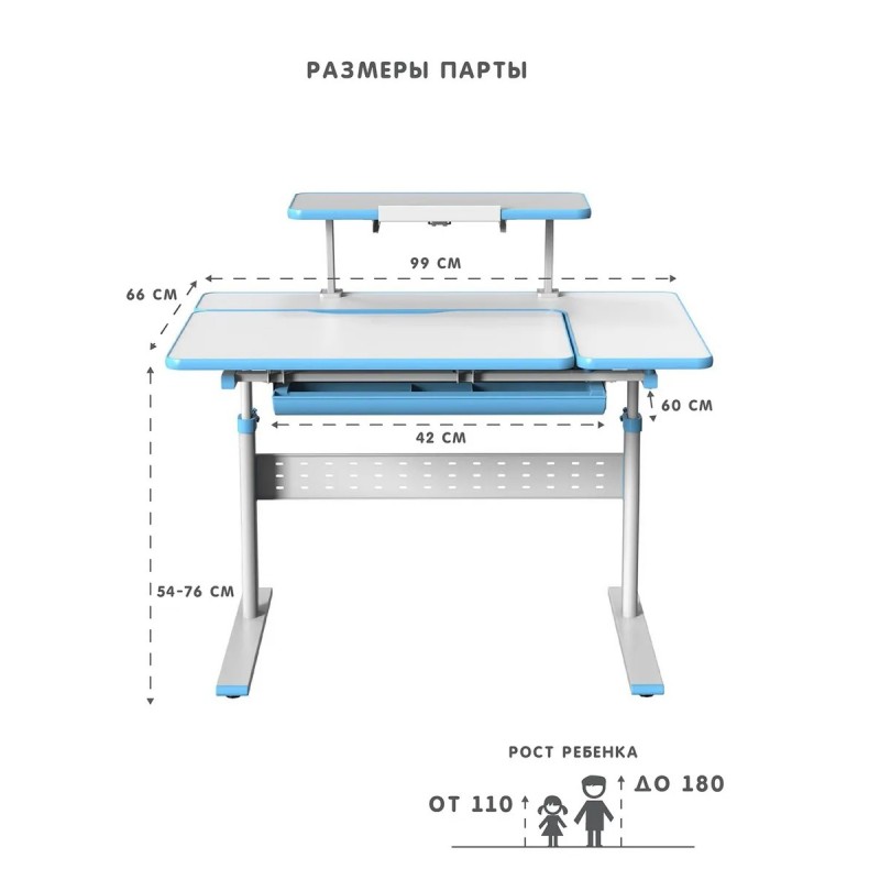 декоративное оформление пластиком с антибликовым покрытием. Диапазон регулировки высоты – от 54 до 76 см. Парта