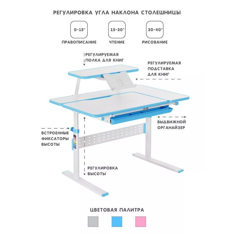 столешницы также можно изменить от 0 до 60 градусов, поэтому парта подойдет не